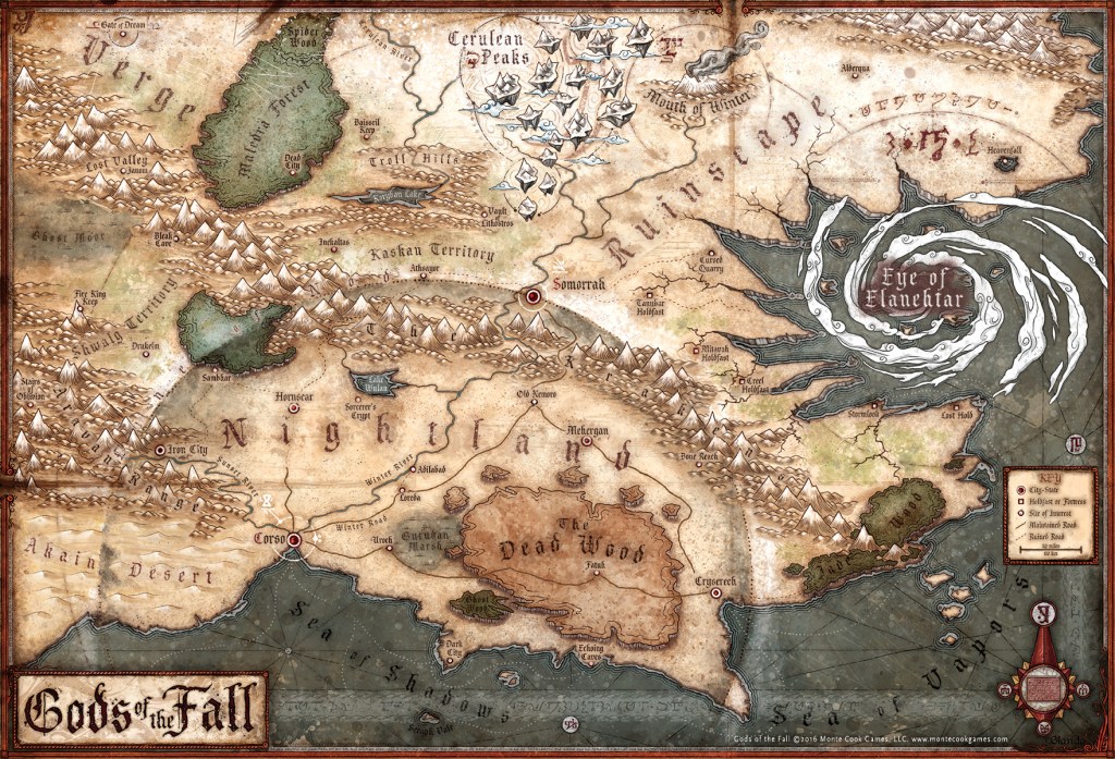 One of the first non-Numenera samples of what has become “standard” Monte Cook Games layout, for whatever reason, the look of the product “feels” rougher. Not being a layout and design guy, I’m not exactly sure I could put my finger on why. The artwork is excellent, and very much evokes the feeling of powerful and expansive character influence that is the basis for the lore of the world. I enjoy the color scheme as well (and am a big fan of purple). But overall, something just feels like it doesn’t “gel” as well with this layout as it does with many of the later ones. Perhaps that is just personal aesthetic, however. The production quality of the book itself is, as usual, excellent, and it feels both sturdy and long-lasting. The map by Jared Blando is both an interesting style choice and evocative as well.