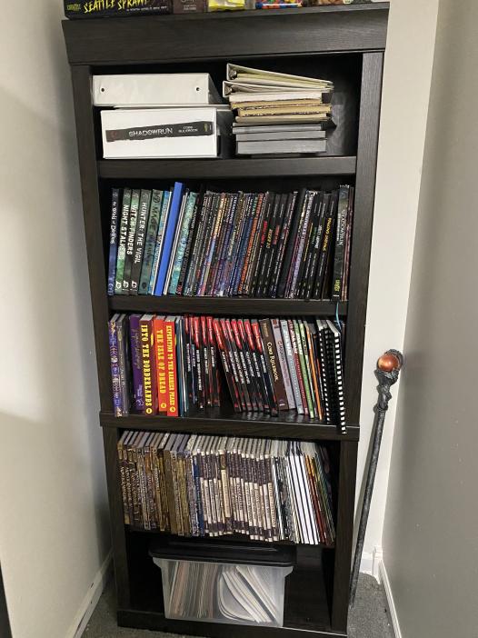 The problem comes in when they release other supplements that contain really helpful content like setting, alternate rules, adventure hooks, and other things.  While not strictly necessary, they can often help a GM and so they pick those up.  Fairly soon, you have gaming shelves that look like mine, and this is only one.  But the eventual problem is quantity.  As the rules page count goes up, unless you have an eidetic or photographic memory, you’re going to have a harder time remembering rules.