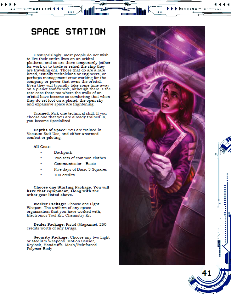 The reason for the changes is that in Hope’s Horizon, we wanted both the species you choose and where they came from to mean something. We felt it would both change who the character was at their core and what their outlook was on the galaxy around them. As a result, each species has several customized types that reflect their unique training, and societal philosophy. After these, there are 4 generic types that any species can take (the Doctor, the Pilot, the Infiltrator, and the Wrench). This is not intended to limit what you can do in your games, but to give you templates of what types customized for a space setting such as this might look like.