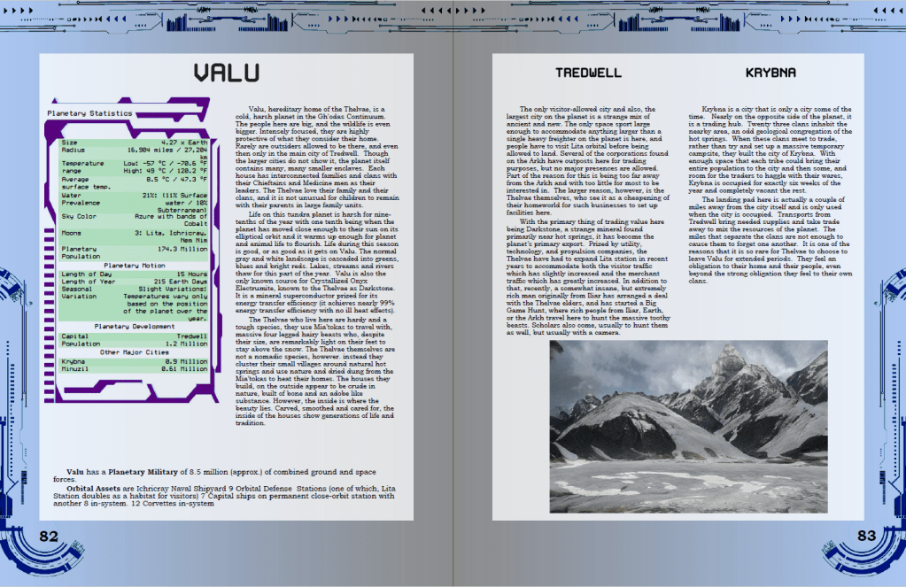 After Equipment comes a short section detailing some of our thoughts regarding running Hope’s Horizon as a Cypher System game. This section will be expanded in the Core Rulebook, but we wanted to give a little bit here as well. Beyond that is 30 pages of setting information detailing some of the core worlds in the United Galactic Territories, the Gh’odas Continuum, and Freespace. Each entry contains an overview of the area itself, some of the major cities/locations, and some rumors and adventure seeds for the GM to use as idea starters. This section will be greatly expanded in the Core Rulebook with much more detail for each system that these planets are in.