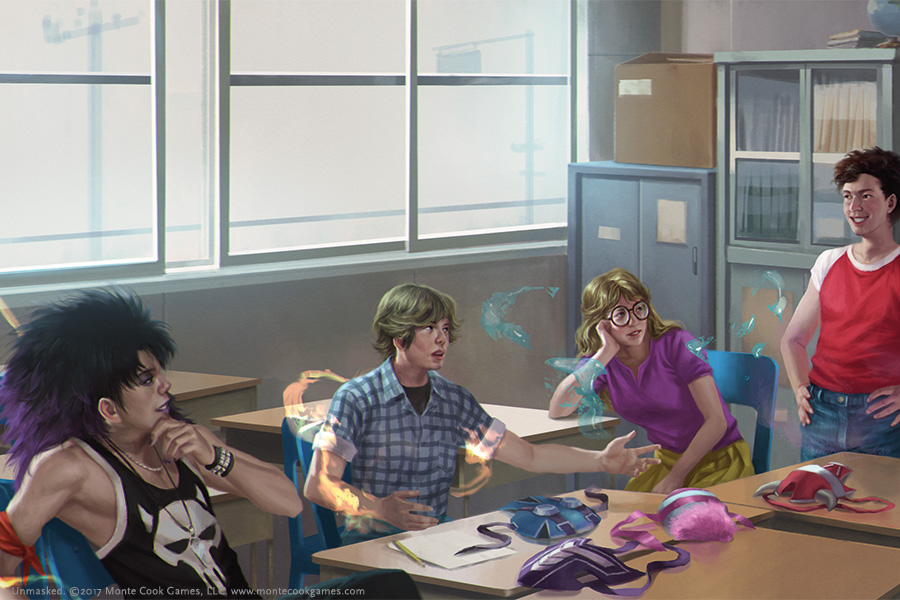 Unmasked involves a two-in-one gameplay. You as a player are playing both a teenager, with the teenager troubles of high school, and you have also been gifted (or cursed depending on how you view it) with a Masked side, the side of you that’s superpowered and has the ability to fight evil things and use mementos . Mementos are the Cyphers of the Unmasked universe and are only usable by the Prodigies (the teenagers with super powers).