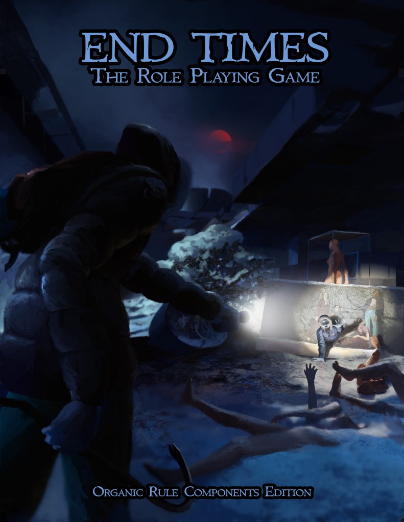 End Times was published under two rulesets. The first version is Powered by the Apocalypse (PbtA), a system originally published with the game Apocalypse World and increased in popularity with titles like Dungeon World, Monster of the Week, City of Mist, and Monsterhearts among MANY others. The second ruleset is Varja Enterprises’ own Organic Rule Components (or ORC). It is worth your time to understand the design philosophy that Varja Enterprises is trying to model with this ruleset. It is, by its own admission, a “crunchy” ruleset, one that is math-heavier in character creation and play than many others. Not necessarily a bad thing but one we’ve found limiting in the past. We try to greet each new game with fresh eyes, however, and this one will be no different.