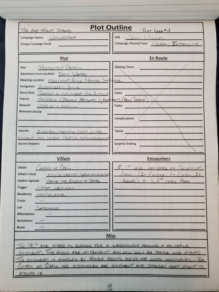 Below, you can find an example filled out based on a “false start” to this campaign. The campaign was originally going to be a duet with myself running it and my Joann playing, but we opted to invite some others after we started to give us more variety in characters and in scenario style (based on skills and abilities). This particular scenario and event never actually happened in the current iteration, but Irizon Thano is actually an NPC and doing basically the same thing he was (except he is now a she).