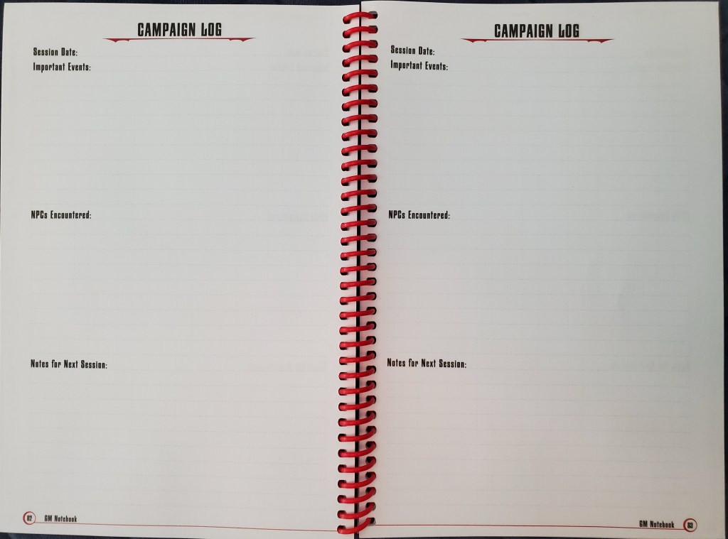 In this style of notebook, there are lots of pages to help organize information about Major (and Minor) NPCs, Adventure Locations, Setting details, Adventure Ideas, Player Character information, and finally, a series of pages to allow you to keep a campaign log. The latter are especially useful, detailing any important events that happened during that session (usually where I talk about the scenario set up and what the players did/encountered in addition to any rewards promised for completion), NPCs encountered (usually I have those detailed elsewhere in this book, so I will put a page number reference for ease of lookup), and Notes for next session. This last section is really important as it is where I note my thoughts regarding what needs to be resolved from a play standpoint based on the results of the session and exactly how the “world” responds to the characters’ actions. In other words, it’s my “living world” section.