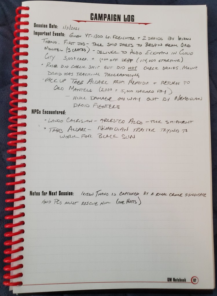 Here, on the other hand, I have a lot of experience and several examples that I have kept for later reference and shameless cribbing. I have tried several different things over the course of my time GMing and what I’ll share with you are the two current best and my thoughts about each of them. First, let’s talk about what I’m using now. I am currently running a Star Wars Edge of the Empire (from Fantasy Flight Games) game for Joann and another couple that we know. My note taking happens in the GM Notebook that I have from Monte Cook Games.