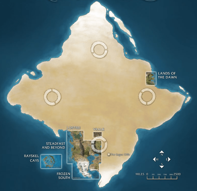 Chapter 9 deals with a group of islands off the shore of the Steadfast known as the Rayskel Cays. The islands in this strange region have bizarre properties and people who live there. Not unknown to the Steadfast, it is still not particularly common for people to travel there without great curiosity and great courage. Finally, Chapter 10 hurls characters all the way across the supercontinent using a portal in the Steadfast land of Thaemor. The portal, called the Great Reach, allowed explorers to discover a region known as the Lands of the Dawn. These lands are settled in a manner similar to the Steadfast, but the cultures and the inhabitants are vastly different, and trying to treat them the same is an almost certain way to get oneself killed. They do however boast new and interesting things to see including areas settled by non-humanoid creatures whose culture and goals are different than those we might be used to.